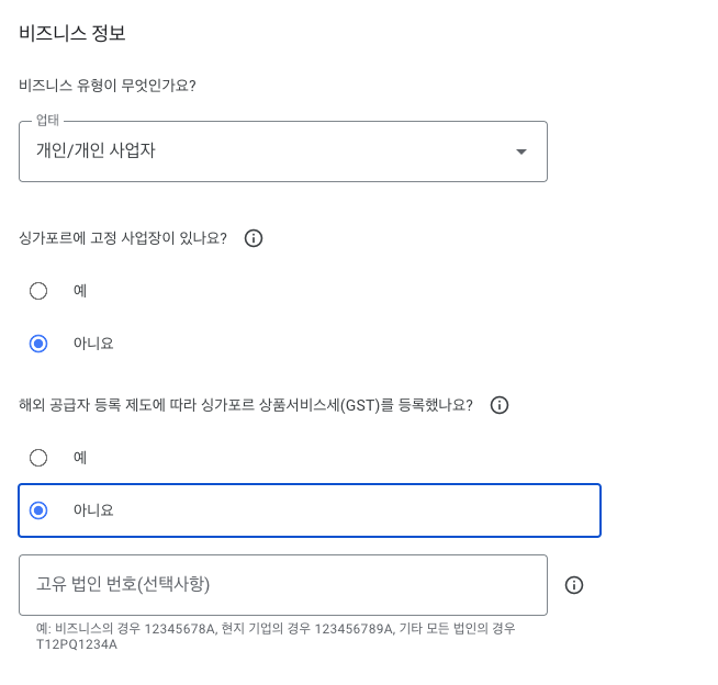 - 비즈니스 유형 : 개인/개인 사업자(만약 다른항목에 해당한다면 다른항목을 선택)