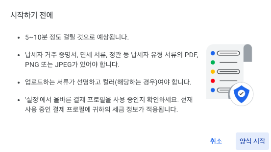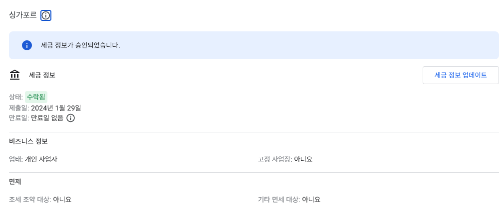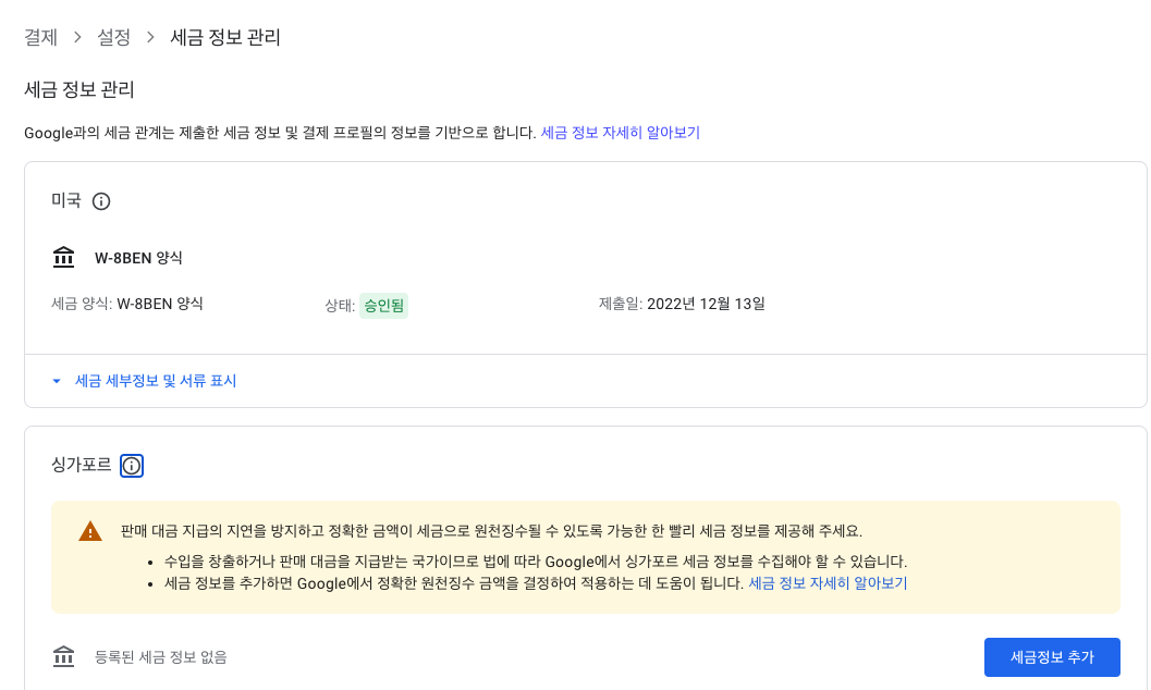 5) 결제정보를 입력하고나면 아래와같이 "세금정보 추가" 항목이 남아있다.