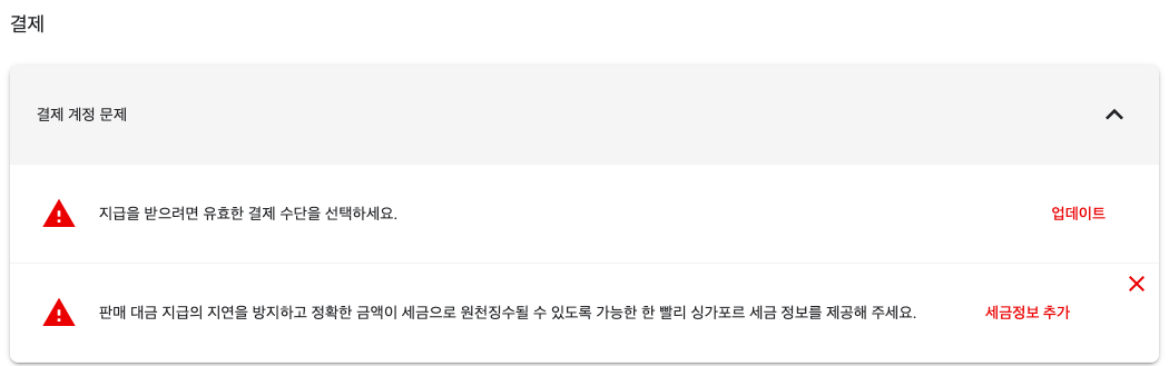 "지급을 받으려면 유효한 결제 수단을 선택하세요." 의 우측에 있는 "업데이트" 버튼을 클릭한다.