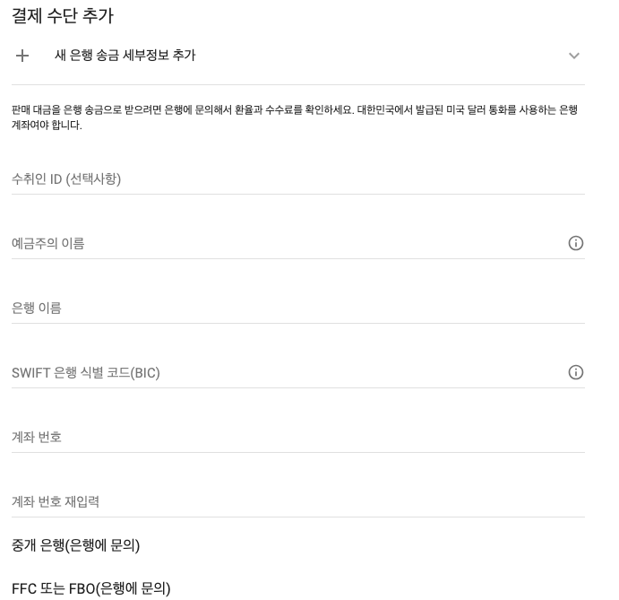 - 중개 은행 정보 : 해당 사항은 선택사항이며, 해당한다면 해당 은행에 문의하여 입력하면 됨
