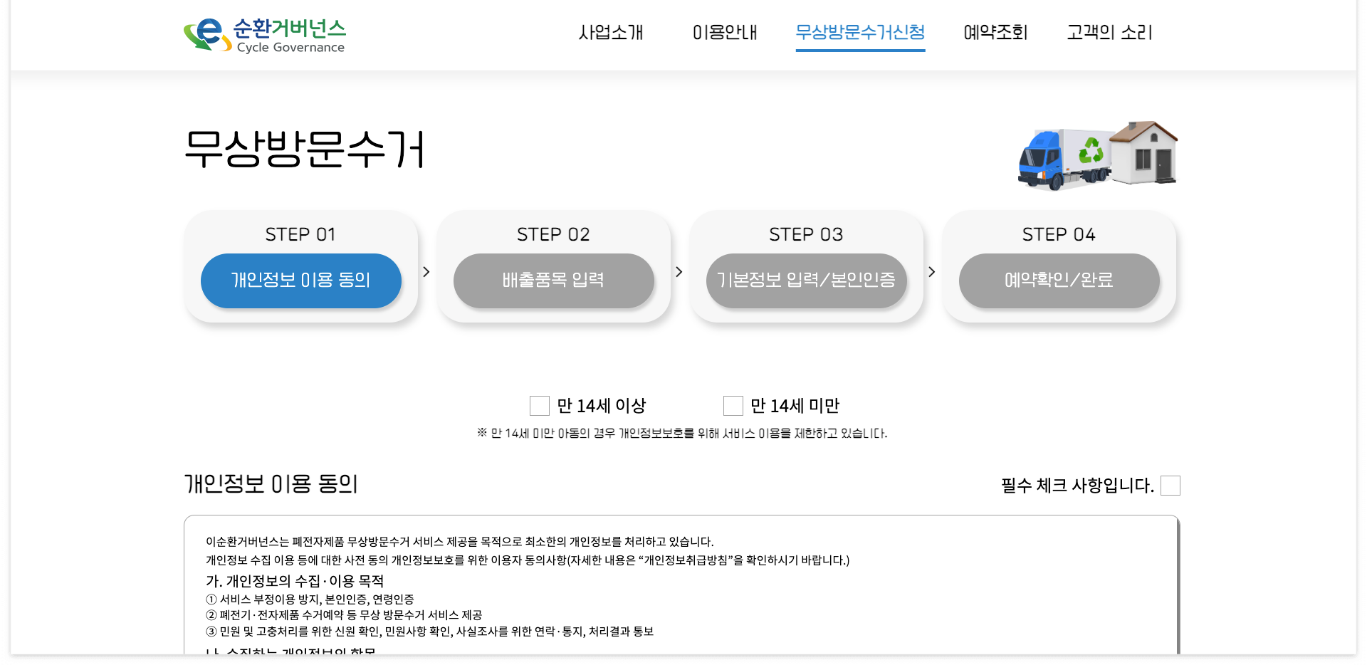 3) 상단메뉴 중 [무상방문수거신청]을 클릭하여 신청서 작성