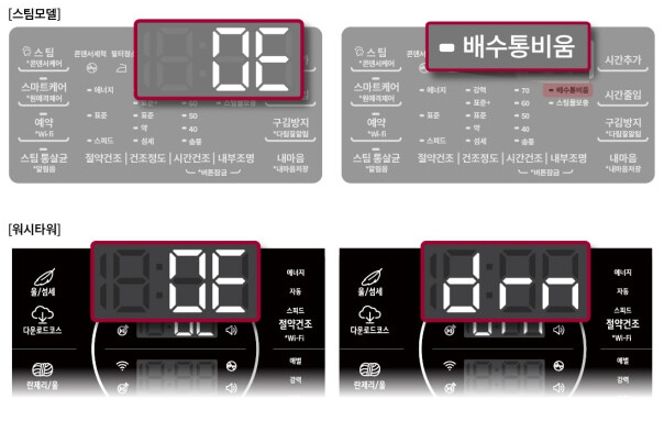 상황 1. [OE], [물버림], [배수통비움], [drn] 에러가 표시돼요.
